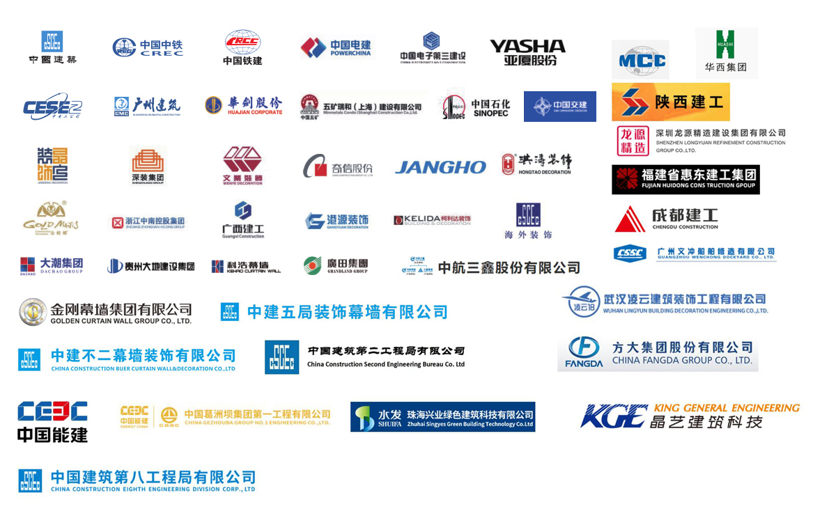 公司參建了諸多大型項目工程,如港珠澳大橋、珠海國際航展、深圳國際會展中心、廣州白云機場、西安全運會場館、成都東安湖大運會場館、樂山奧體中心、洛陽奧體中心、增城富士康廠房、惠州中海油、陽江核電站、珠三角各地鐵線、高鐵站、廣西桂林機場、廣西柳州文化廣場、四川成都天府機場、海南??诿捞m機場、西安絲路會展中心、惠州北站等等。與中國建筑、中國中鐵、中國鐵建、中國電建、中國交建、中國中冶、中國能建、廣東建筑、廣西建工、廣州建筑等大型國有企業(yè)下屬公司及江河幕墻、金螳螂裝飾等各大建筑裝飾、幕墻裝飾公司達成長期友好合作關系。
